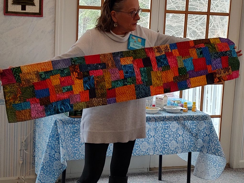 This quilt top by Hildreth Curran features fabrics from her stash that she dyed using the Japanese Shibori method. Everyone in the Guild is looking forward to learning more about her process! She pieced these based on her own design. To see more of Hildreth's work follower her on Instagram - @HildrethColor.