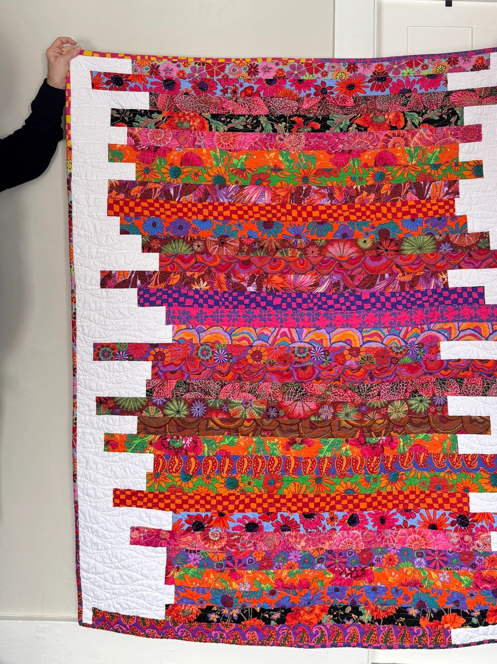 John Skafidas made this Kaffe Fassett piano quilt for his wife Maggie. He used a random number generator for the lengths.